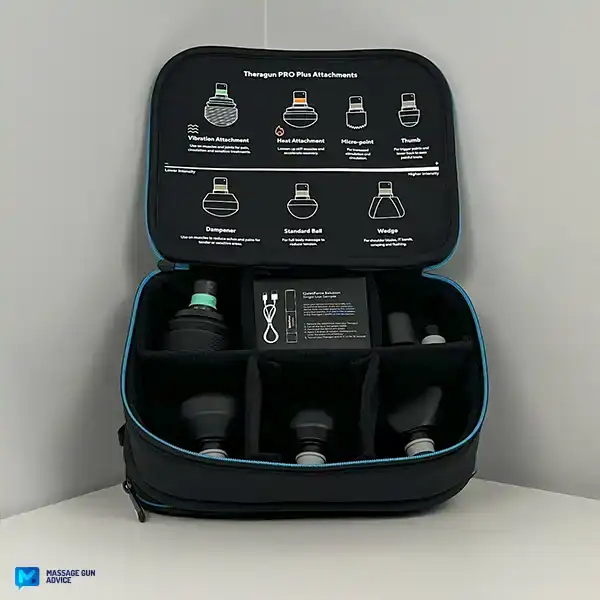 Theragun box, soft case, and Theragun attachments guide.Theragun case: The Pro Plus has two separate compartments.